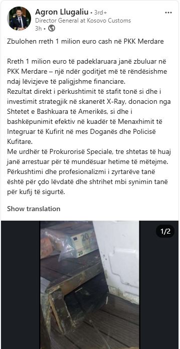 “Rreth 1 milion euro të padeklaruara janë zbuluar në PKK Merdare – një ndër goditjet më të rëndësishme ndaj lëvizjeve të paligjshme financiare. Rezultat direkt i përkushtimit të stafit tonë si dhe i investimit strategjik në skanerët X-Ray, donacion nga Shtetet e Bashkuara të Amerikës, si dhe i bashkëpunimit efektiv në kuadër të Menaxhimit të Integruar të Kufirit në mes Doganës dhe Policisë Kufitare.