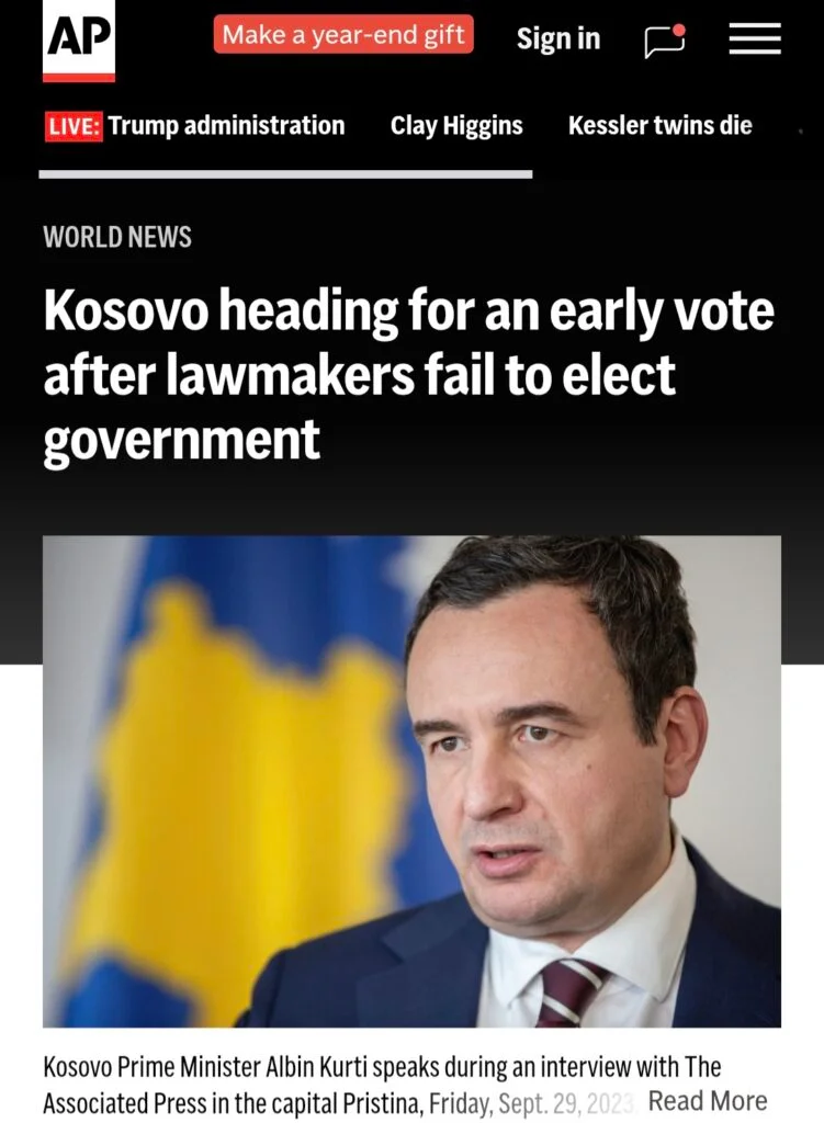 Deputetët e Kuvendit të Kosovës të mërkurën dështuan të zgjedhin një qeveri të re, duke hapur rrugën për zgjedhje të parakohshme pas një krize politike që ka zgjatur me muaj në vendin e vogël ballkanik, shkruan AP, transmeton Gazeta Politika.