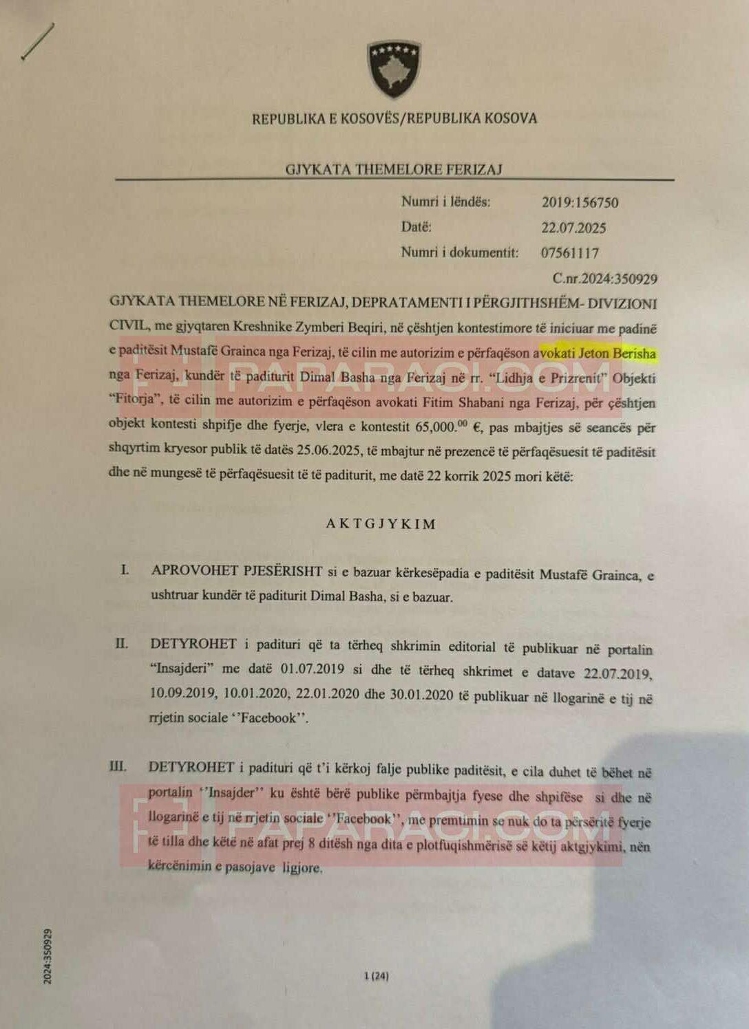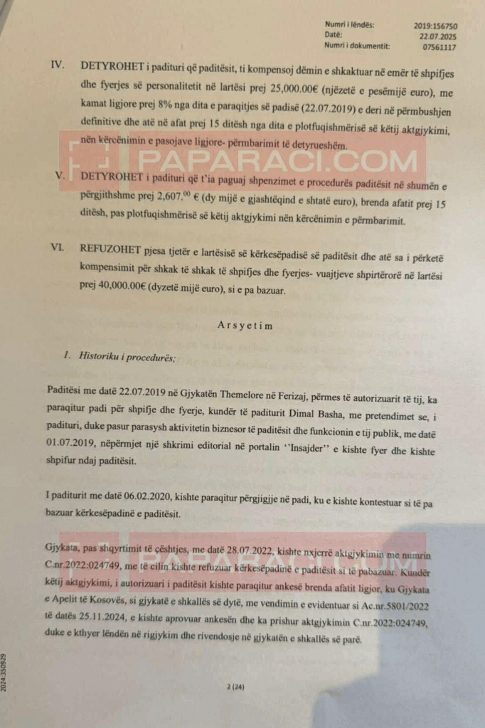 Basha do të paguajë 25 mijë euro dhe duhet të kërkojë falje publike. Gazeta Paparaci ka publikuar Aktgjykimin.