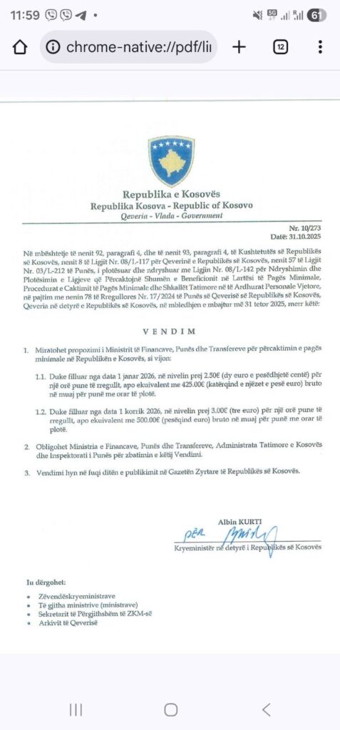 Sipas vendimit zyrtar me numër 10/273, të datës 31 tetor 2025, i nënshkruar nga kryeministri në detyrë Albin Kurti, paga minimale do të jetë: 425 euro bruto duke filluar nga 1 janari 2026, për një punë të rregullt me orar të plotë dhe  500 euro bruto duke filluar nga 1 korriku 2026, po ashtu për punë të rregullt me orar të plotë.