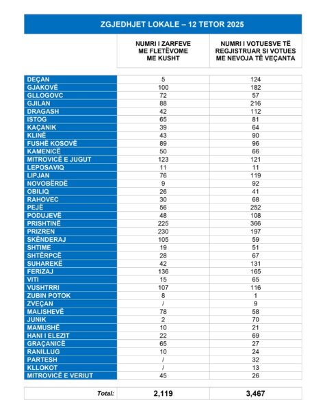 Sipas KQZ-së, në votimin me kusht janë më shumë se 2,119 zarfe me fletëvotime, që i përkasin të dyja llojeve të zgjedhjeve – për kryetarë komunash dhe për kuvendet komunale. Ndërkohë, më shumë se 3,467 votues me nevoja të veçanta ishin të regjistruar për të votuar përmes ekipeve mobile.