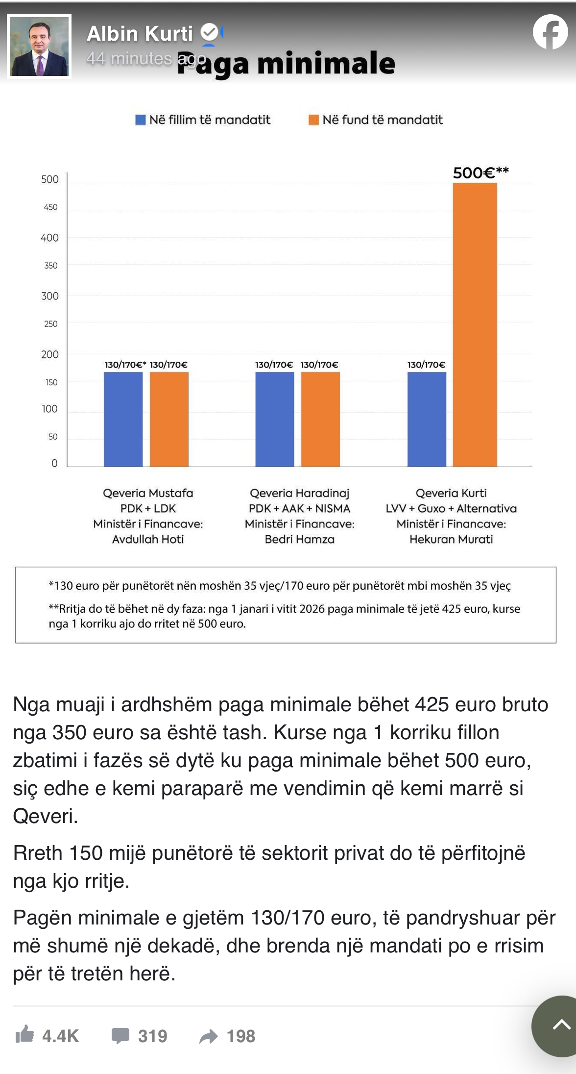 “Nga muaji i ardhshëm paga minimale bëhet 425 euro bruto nga 350 euro sa është tash. Kurse nga 1 korriku fillon zbatimi i fazës së dytë ku paga minimale bëhet 500 euro, siç edhe e kemi paraparë me vendimin që kemi marrë si Qeveri” – ka shkruar ai.