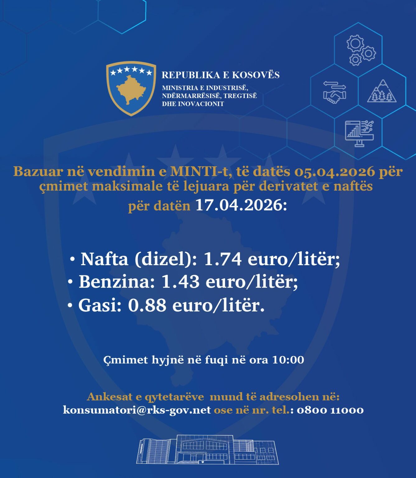 Sipas vendimit të MINT-it, të datës 05.04.2026, çmimet për produktet e naftës janë përcaktuar si në vijim: nafta (dizel) do të shitet me çmim maksimal prej 1.74 euro për litër, benzina me 1.43 euro për litër, ndërsa gazi me 0.88 euro për litër.