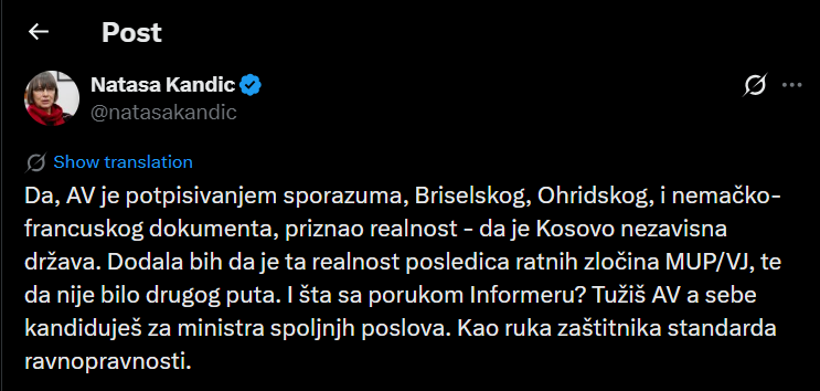 “Po, duke nënshkruar Marrëveshjen e Brukselit, Marrëveshjen e Ohrit dhe dokumentin gjermano-francez, AV (Aleksandar Vuçiq) ka pranuar realitetin – se Kosova është një shtet i pavarur. Do të shtoja se ky realitet është pasojë e krimeve të luftës nga MUP/J i Serbisë”, shkroi ajo.