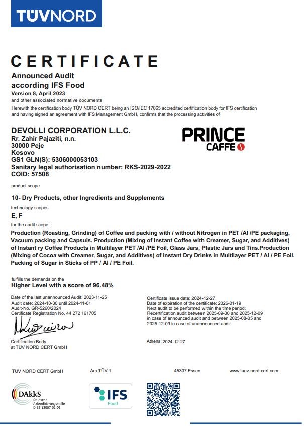 Për ta arritur dhe ruajtur këtë nivel, Prince Caffe dhe të gjitha produktet e saj përcjellëse posedojnë dhe operojnë në përputhje të plotë me certifikatat më të larta ndërkombëtare të cilësisë, sigurisë dhe standardit, duke përmbushur kërkesat e tregjeve evropiane dhe ndërkombëtare.
