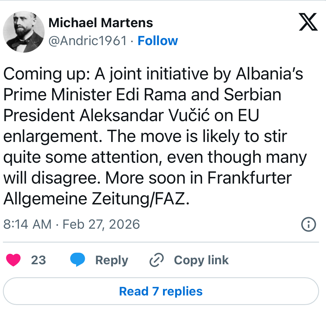 “Një iniciativë e përbashkët nga kryeministri i Shqipërisë Edi Rama dhe presidenti serb Aleksandar Vuçiq mbi zgjerimin e BE-së. Ky veprim ka të ngjarë të tërheqë mjaft vëmendje, edhe pse shumë nuk do të jenë dakord”, ka shkruar ai në X.