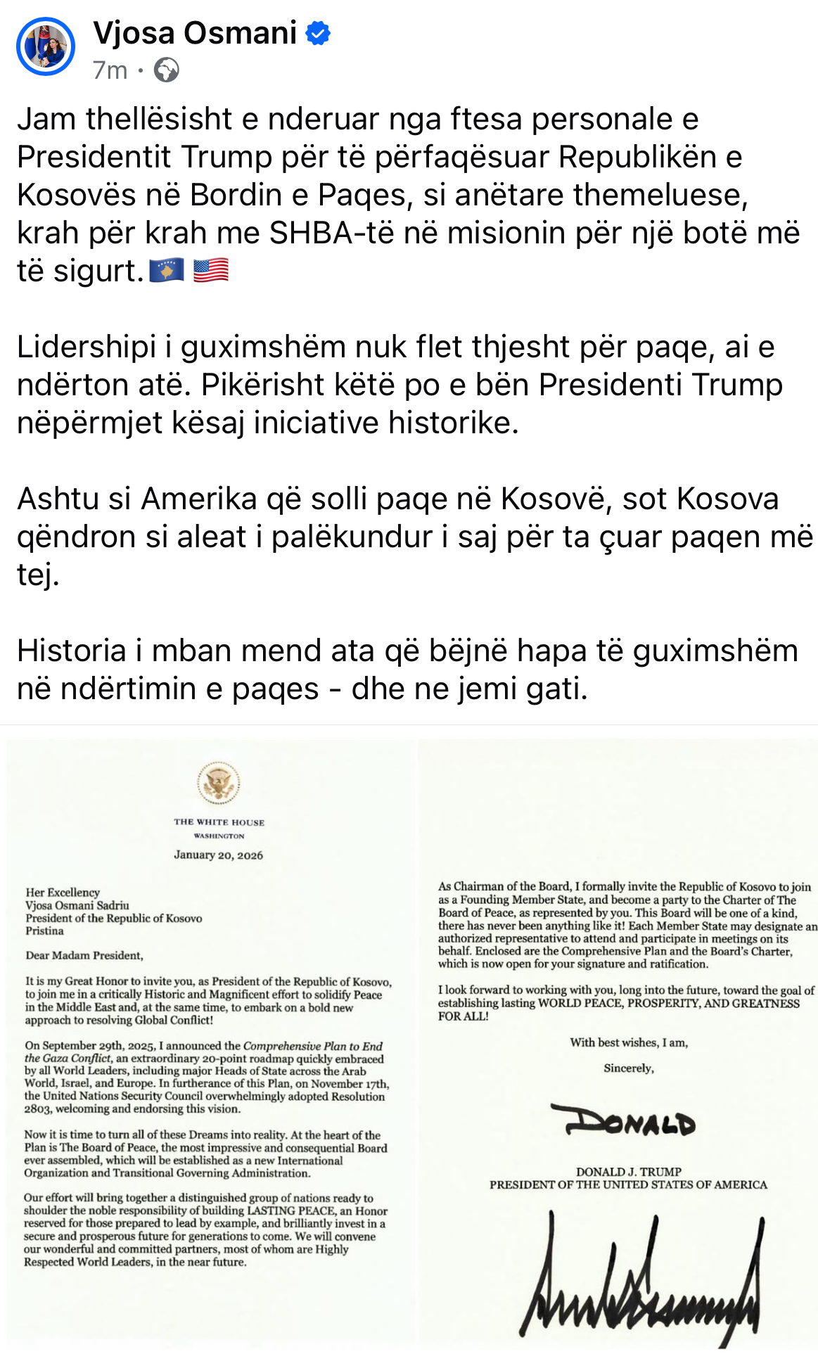 Presidenti i ShBA-së i ka dërguar letër presidentes Osmani, për ta ftuar si themeluese të Bordit të Paqes, nismë kjo botërore e iniciuar nga vetë Donald Trump.